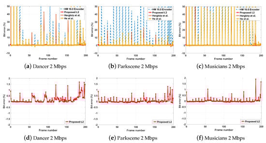 In addition, the frame-wise rate-controlling performances of the encoding algorithms were analyzed using the percentages of error between the allocated bits and actual bits per frame. A graphical illustration of this frame-wise percentage error is presented in the Figure 2. It can be observed that the rate-controlling algorithms implemented in HM 16.0 and other state-of-the-art encoding algorithms suffer from large percentage errors throughout the video sequence. The incorporation of a third parameter within the mode selection cost function in He et al. [20] and Herglotz et al. [46] crucially affect the rate controller in achieving the allocated number of bits for a given block. For example, both these algorithms use an RD-optimization-based bit allocation, QP, and Lagrangian parameter determination approach [48] for the rate control while utilizing three parameters in the cost function (rate, distortion, and decoding-complexity) for the coding mode selection. The correlation that exists between the three parameters is, however, ignored when performing the rate control, which results in large average rate-controlling errors, as illustrated in the Table 1. The rate-controlling algorithm in HM 16.0 which follows a R--based bit allocation and coding parameter selection approach also shows some deficiency in achieving the allocated bit budget for each frame. However, as illustrated in the Table 1, the HM 16.0 encoder still demonstrated a 1.75% error in its rate-controlling function.