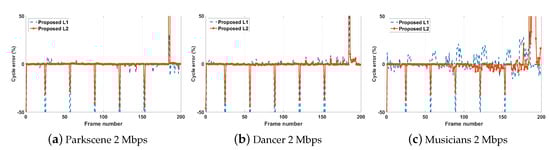 An illustration of the frame-wise percentage error between the target decoding-complexity and the achieved decoding-complexity for the proposed algorithm at two complexity levels for a given bit rate (2 Mbps) for (a) Parkscene, (b) Dancer and (c) Musicians test sequences.