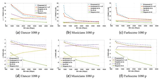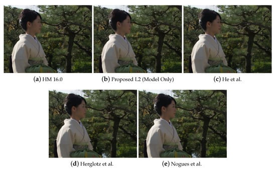 Figure 4 also demonstrates the decoding-complexity reduction that can be achieved for a 1 dB quality loss in PSNR. It can be observed that the proposed algorithm on average achieves a greater across all bit rates. This is much larger for the proposed algorithm at lower bit rates, due to the reduced quality impact with respect to the HM encoded bit stream. Thus, it is apparent that the proposed algorithm can produce more decoding-complexity reduction than state-of-the-art algorithms for each 1 dB quality loss. Finally, Figure 5 illustrates the visual quality impact of the video sequences reconstructed from the bit streams encoded by HM16.0, the proposed algorithm, and other state-of-the-art methods. It can be observed that despite the PSNR drops listed in the Table 3, the bit streams generated by the proposed algorithm retain a visual quality level similar to that of the bit streams prepared by the HM 16.0 encoder.