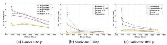 The algorithms proposed by He et al. [20] and Herglotz et al. [46] both achieved decoding-complexity reductions in the range of 10% and 20%, respectively. However, it was observed that those were achieved at the expense of a significant reduction in PSNR for a given bit rate. For example, although Herglotz et al. [46] uses a decoding-complexity estimation model [58,59,60], the bit rate, decoding-complexity trade-off factors are selected independently; thus, the impact on each other is overlooked during the coding mode selection. Furthermore, only the bit rate trade-off factor [47,49] is content-adaptive, and the decoding-complexity trade-off factor remains agnostic to the dynamics of the video sequence, which ultimately results in a higher quality loss. Similarly, the method proposed in [20] uses predefined trade-off factors and decoding-complexity-aware coding mode selection only at the PU level. Thus, the sacrifice made in video quality to maintain the bit rate requirement is greater, and performance is inferior to Herglotz et al. [46]. These results are illustrated graphically in the vs. decoding-complexity graphs presented in the Figure 4. Here, it can be observed that both these algorithms would experience a higher quality impact in a rate-controlled scenario if they were to achieve a particular decoding-complexity. However, it should be noted that the encoding algorithm proposed by Herglotz et al. has shown improvements in very low-in-complexity video sequences, such as “band,” “cafe,” “poznan st.,” etc.