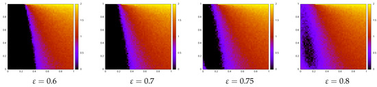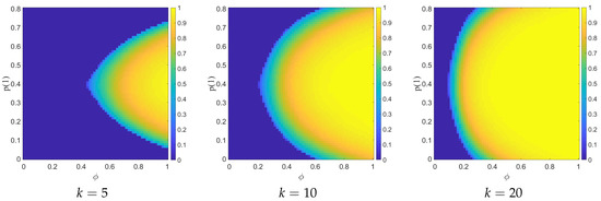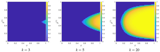 If the connectivity k is lower than 3, it is not possible to find nodes such that at large times, regardless of the values of the control parameters. Instead, for there are certain values of and for which undergoes a phase transition and passes from 0 to a non-null-value. Increasing the value of k, the region in the graph in which increases its size, and for example with , as shown in Figure 2, it includes the majority of the phase plane.