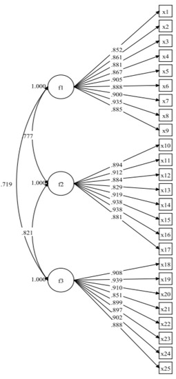 As for the goodness-of-fit indexes of the three factors, the results show a comparative fit index (CFI) of 0.957, a root mean square (RMSEA) of 0.109 and a standardized root mean square (SRMR) of 0.032. It should be noted that, according to [53], the values for considering a model to have a good fit are a CFI equal to or greater than 0.95, an RMSEA not greater than 0.10 and an SRMR less than 0.05. The values obtained reflect that the CFI index has a high comparative fit value above 0.95 and the error rate reflecting the SRMR is low, below 0.05. Additionally, the RMSEA index is within the observed limit of 0.10.