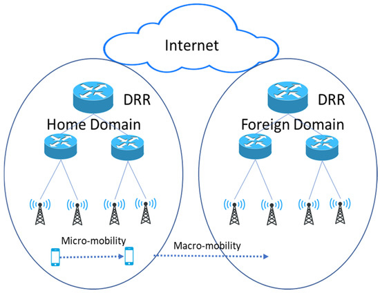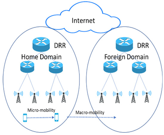 From a mobility perspective, mobility management systems can be classified into two main categories: IP macro mobility management protocols and IP micro mobility management protocols. The macro-mobility management approach is used to manage mobile device movement on a large scale between different network domains, while maintaining ongoing connections. Mobile IP [17] has different versions; Mobile IPv4 and Mobile IPv6 are the best known and adopted protocols for cross domain mobility management. IP micro mobility protocols involve the management of mobile nodes movement on a local scale within the local domain. Mobile IP is not a good solution for mobility management when the movement is relatively frequent, because of the mobility signaling overhead caused by this mechanism when Mobile IP tunneling introduces high network overheads. Micro mobility solutions therefore aim to minimize the handover delay and keep signaling overhead to a minimum. They manage the local movement of mobile nodes without registration between mobile nodes and other distant home agent nodes, and so they manage to reduce binding updates for the distant home agent, delay, and packet loss during handover procedure. Several protocols were proposed in this category, such as HMIP [13], HAWAII [18], and cellular IP [19]. Figure 1 shows HAWAII architecture that depicts macro and micro mobility levels of mobile nodes within and across different domains. In this paper, mobility management solutions are classified from the mobility point of view into macro mobility management and micro mobility management, which are introduced in the following subsections.
