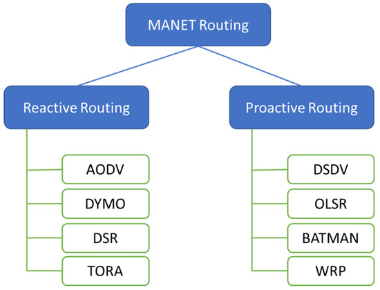 There are several surveys of MANET routing in the literature. The most recent surveys concentrate on particular MANET aspects, such as power efficient routing [20], hybrid routing mechanisms [21], congestion awareness and adaptive routing [22], or ant colony-based routing [23]. A comprehensive and detailed survey was published by Alotaibi and Mukerjee [24], however, for the purpose of this paper, the focus is only on the major classification of MANET routing. For a more detailed review, please refer to the above-mentioned papers.