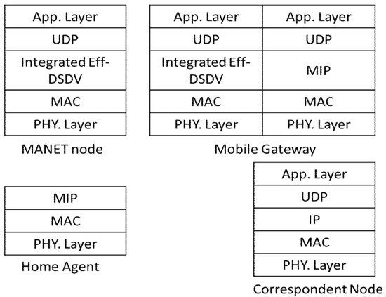 Mobility management in hybrid ad-hoc networks and the internet environment [57,58] proposed an architecture based on Mobile IP that consists of three layers; internet domains that contain home and foreign agents and corresponding nodes, mobile gateway nodes as the second layer, and MANET nodes as the third layer. The proposed architecture uses a distributed buffer management approach to provide reliable data delivery. Foreign agents are equipped with buffers to store traffic coming from the internet and the mobile gateway buffers are used to store MANET traffic that can be distributed later within the MANET or towards the foreign agents. The proposed architecture uses reactive and proactive gateway discovery, although there are no details about how the gateway discovery operates. It also uses a registration process to entitle a mobile node to register with a gateway node. The registration process takes a multi-layer registration approach. A mobile node initiates a registration request and sends it up the layer architecture to the gateway, then to the foreign agent, and finally to the initiator’s home agent. The home agent creates the corresponding mobility binding and sends the registration confirmation down the architecture to the mobile node, which can then complete the registration with the gateway. The system supports handover between different gateways (micro mobility) and between different MANETs (macro mobility). It proposes three variant handover mechanisms: Mobility management with force handover, mobility management with optimized handover, and mobility management with prediction. The first is used if a mobile node loses its connection with its gateway. The second mechanism is used for handover where a mobile node finds a shorter route to another gateway and its route to its current gateway is still valid. The third mechanism combines prediction with the optimized handover. The handover decision is based on the shortest path and predicted gateway signal strength.
