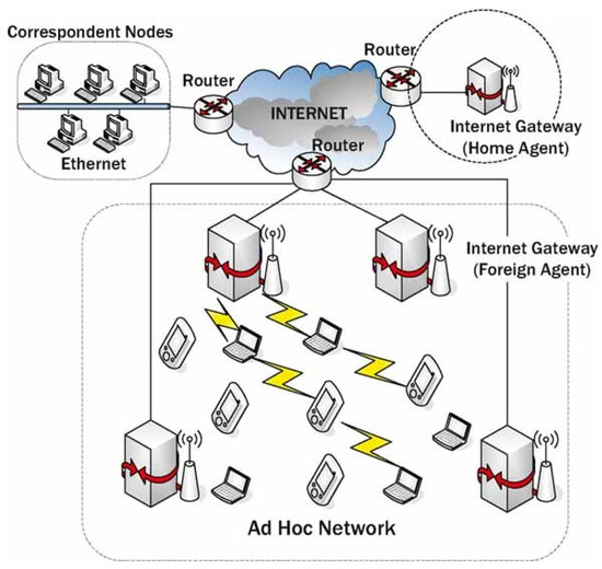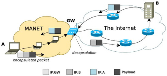 MANET is a standalone network, and communication is restricted to the nodes’ transmission coverage area. To increase its connectivity and its application scope, however, MANET can be connected to the IP network, forming a hybrid MANET. The integration of MANET with the IP network provides many advantages for both networks. The integration reduces communication and deployment costs and helps to extend the coverage of the existing infrastructure. It also provides additional services for the MANET. The integration provides MANET nodes with internet access, and thus increases the application scope for MANET. This would then allow MANET users to access web services that are not available in the traditional stand-alone MANET. Moreover, the recent development in the cellular network technology enhances the feasibility of integrating MANET with the Internet. Fifth-generation 5G technology, for example, comes with its merit of increased bandwidth and reduced delay, which ease the integration of ad hoc networks and IP networks [4,5,6].