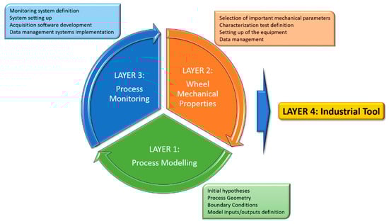 The present work proposes a down-top approach composed of different layers of the DT. The underlying hypothesis is based on the fact that process knowledge is distributed between very different agents (wheel manufacturer, machine-tool builders, end-users of the process, and fundamental research groups), and it is necessary to effectively share this knowledge. The aim is to produce a virtual mirror of the real process, integrating innovative monitoring systems (intelligent grinding wheel) and original theoretical and experimental approaches to grinding processes. The structure of the DT is composed of four layers, which integrate: (1) scientific knowledge of the process (advanced process modeling and numerical simulation); (2) characterization of materials through specialized mechanical testing; (3) advanced sensing techniques, to provide feedback for the process models; and (4) knowledge integration in a configurable open-source industrial tool. Each layer is described in detail in the following paragraphs, while Figure 1 illustrates the general concept underlying the DT.