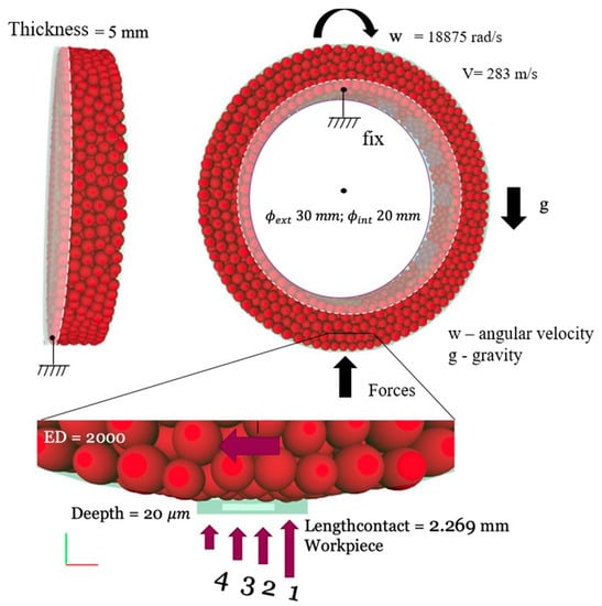 In the present study, the discrete element method (DEM) has been selected as the optimum numerical tool for the modeling and simulation of the grinding process. DEM models allow for reproducing the granular structure of the grinding wheel and the mechanical behavior of the bonding bridges. Likewise, the development of cohesive beam models allows for the simulation of continuous bodies using DEM []. The mechanical properties of the bonding agent can be replicated at a microscopic level in such a way that the complete behavior of the wheel body can easily be reproduced, regardless of its composition. The interactions with the part material can also be modelled; by doing so, it is possible to predict critical process data such as the contact forces, temperatures and power consumption. The effect of wheel rotation can also be included in the model, which is an interesting contribution, particularly for high-speed grinding processes. These possibilities are supported by preliminary investigations conducted by our research group, such as those published in [,]. Nonetheless, intensive research is currently being carried out to optimize DEM models and their application to the DT of the grinding process. Figure 2 shows a DEM model of a high-performance alumina grinding wheel. This model is being developed in collaboration with the wheel manufacturer UNESA (Abrasivos UNESA, S.A.,Hernani, Spain) and the ENSAM of Bordeaux. In the present DEM model the real grinding process is modelled. To this end, not only real grinding parameters are considered, but also the composition of real grinding wheels. Firstly, a discrete grinding wheel is built in order to characterize the mechanical behavior of the wheel, especially the behavior of the bond. To this end the size of the discrete elements (DEs) are equal to the real abrasive grain, 350 µm. This hypothesis allows the isolation of a bond fracture from the other types of wheel wear. In order to minimize the computational cost of the model, instead of modelling the real grinding wheel, which has an actual diameter of 400 mm, a wheel with a reduced diameter of 30 mm is modelled. Likewise, the width and thickness are also reduced, and are modelled with a width of 5 mm and a wheel thickness of 10 mm. The modification of the external diameter of the grinding wheel also affects different process parameters, such as the grinding wheel speed or the contact length, therefore the corresponding parameter correlations are also performed. Moreover, the real contact length and the real contact time is considered in the DEM model, therefore, a specific workpiece shape is designed. Finally, the real force generated during grinding is introduced in the model with the aim of reproducing the mechanical behaviour of the grinding wheel during the grinding process.