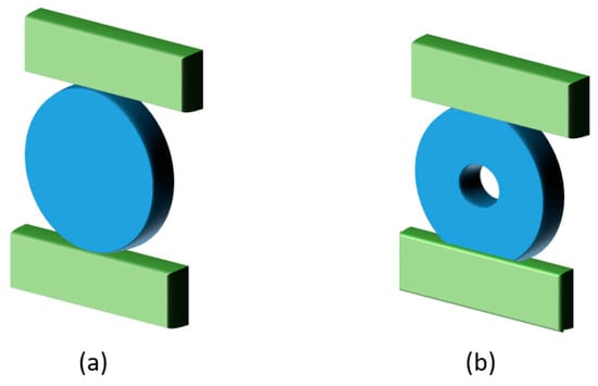 In the reviewed literature, the Brazilian tests are carried out using a disk, as shown in Figure 3a. However, this specimen configuration does not take into account the shape of the grinding wheel, which has a central hole. Moreover, the shape of the specimen determines the beginning of crack propagation. Therefore, new specimens are designed and manufactured as shown in Figure 3b. The specimen presents a central hole and flat surfaces to secure the specimen and to impose the load.