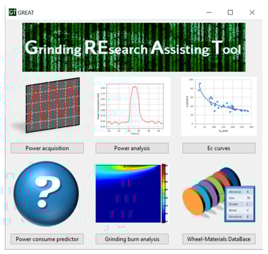 GREAT is being developed in Python, and it is based on a simple user-interface that assists the user during grinding operations. In order to do so, the results obtained from numerical models developed in Layer 1 must be converted into a set of tables and equations that will be stored in the wheel–material database (see Figure 4). Data for the specific grinding wheel are fed from Layer 2. The reduced models are correlated with the current grinding operation through the interaction with Layer 3, since the GREAT software must be able to receive data from the different sensors implemented both on the machine and on the grinding wheel. Thus, at the current stage it is possible to integrate actual power consumption data (power acquisition module in Figure 4). Since the software is open and completely scalable, in the near future it is anticipated that data from temperature sensors, force gauges, accelerometers and other advanced instrumentation will be included. Moreover, one of the advantages of this software is the developed user-friendly interface, which is intuitive and easy to use. This feature makes GREAT a suitable tool for both industrial and academic environments.