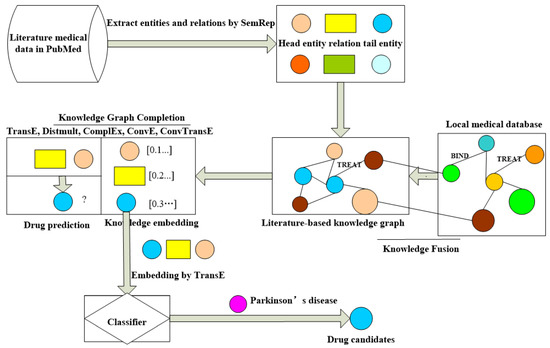In this paper, our proposed DRKF aims to predict drug candidates that can treat Parkinson’s disease. The framework includes the extraction of medical entities and relations, knowledge graph construction, knowledge fusion, knowledge graph completion method, and machine learning classification for drug repurposing. As shown in Figure 2, the specific process is as follows.