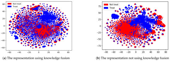 We employ the t-SNE [29] dimensionality reduction tool to perform dimensionality reduction and visualization processing on the training set in the fused knowledge graph and the literature-based knowledge graph that was used in machine learning methods. The classification effect of Figure 3b has a higher degree of aggregation than the result of Figure 3a, as shown in the Figure 3. The information expression ability of the embedding acquired by entities in fused knowledge graph is significantly better than that of the knowledge graph without fusion. The superiority of knowledge fusion is more intuitively demonstrated through visual display.