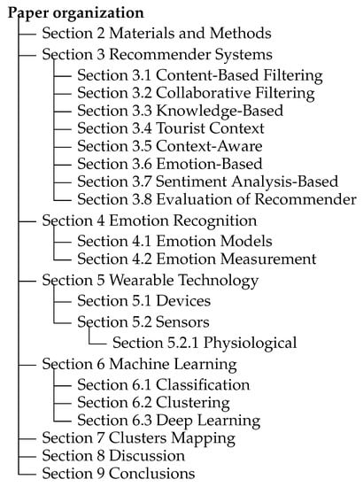 Therefore, the purpose of this study is to provide an overview and understanding of the theoretical background, approaches, models, and methods for the implementation of ER-based tourism recommender systems. This document presents a scientometric review that covers the analysis of research documents published from 2000 to 2019. Figure 1 shows the organization of this paper. Section 2 details the materials and methods used in the preprocessing and analysis of bibliographic datasets. Section 3, Section 4, Section 5 and Section 6 address the four main categories around the classification of recommender systems, emotional detection based on wearable sensors’ data, and proposed machine learning approaches. Besides, Section 7 presents the relationship between the thematic clusters with the recommendation, tourism, and emotions systems. Finally, Section 8 summarizes the main findings found in this work.