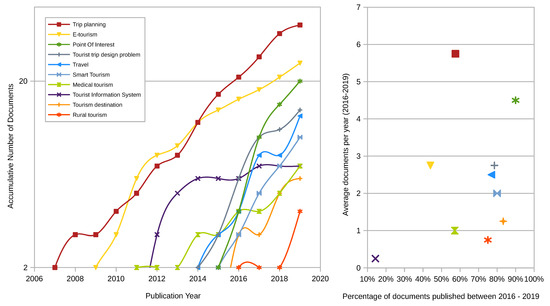 - Third, it shows the statistical graphs of the bar and parametric trend analysis constructed with the indicators of Average Documents per Year (ADY) and Percentage of Documents in Recent Years (PDLY) [37]. It is interesting to highlight the rise of the RS and tourism as transversal and thematic axes. Figure 2 shows the trend bar graph of the main categories and highlights in the orange bar the documents published in the last four years in sentiment analysis, wearable devices, physiological signals, and use of ML algorithms in the ER. Also, it includes the value of PDLY (2016–2019). Similarly, the trend analysis in Figure 3 uses the ADY and PDLY indicators to describe the behavior of the strongly related themes to SR-based research. The graph on the left shows the evolution of the S curve of technology or category calculated by the number of documents accumulated per year (logarithmic scale). It represents the initial evolution, the period of growth, and the boom of the publication of documents related to research topics. While the parametric scatter graph located on the right side visualizes the growth of publications in recent years (2016–2019). New themes have emerged to support tourism SR development, such as sentiment analysis, wearable devices, social networks, and ML algorithms. The thematic axes of ER, affective computing, and collaborative filtering are of great interest to recommenders.