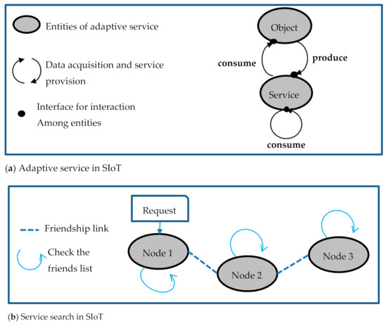 Figure 1a illustrates the concept of SIoT, there are two entities: object and service. These entities can provide and consume services and/or data. In this sense, services themselves can consume data produced by other services to form a composite service or to be used for other objectives. Figure 1b shows a mechanism of service search in SIoT, where the communication is in a decentralized manner. When a node receives a request that includes the requirements of a customer node, it verifies if it can respond to this request by itself or by its friends, elsewhere it will be transmitted to a given node until the provider node is found. The similarity between the request requirements and service is divided into two types that are proximity and point. The point type is the provider node should respond strictly to the declared requirements such as monitoring the temperature at a fixed location, while in the proximity type is the provider node could respond flexibly to the declared requirements such as monitoring the temperature at a specific area.