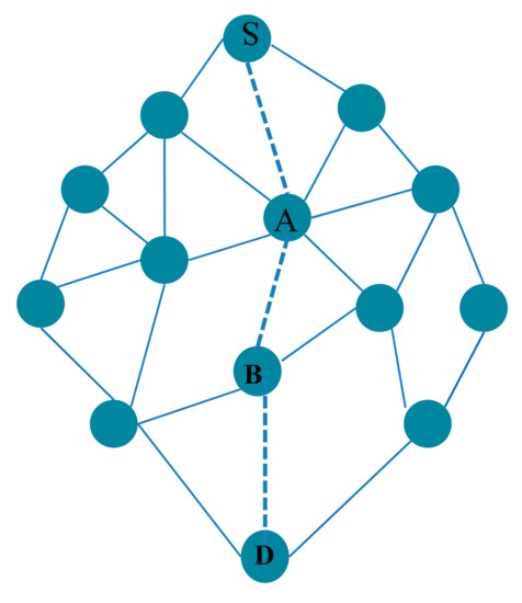 Figure 2 shows a simple example of a social network (it is considered as a mesh-like network), where links represent friendships’ connection ties, while the dashed lines are the path followed by node S to reach the provider node D. When a node S receives a request, it can retransmit or execute it; in case of retransmission, the node S can choose the friend A, and by the same manner, the request will reach to the provider (executor) node D. The path achieved by the request in this example is the shortest path length; it makes the service search rapid, but that does not mean that it is the best path. Node A can transmit the requests more frequently than others; therefore, it will consume more energy. For this, during the search phase, the best path to achieve a provider is a short path (for the rapid search phase), where the associated/constructed nodes have sufficient energies (to extend the network lifetime [34]).