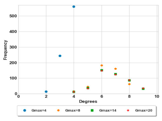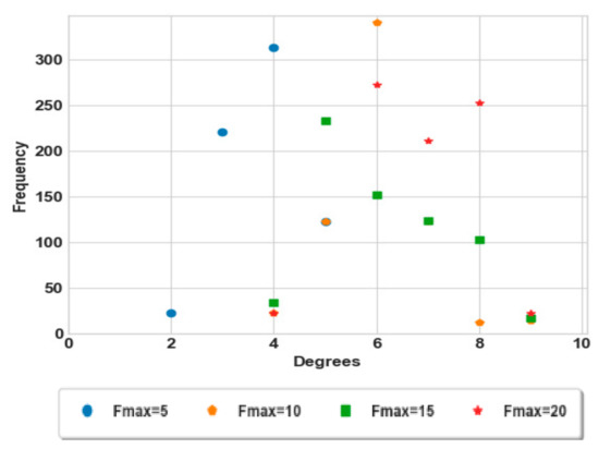 Figure 7 shows the degree distribution after execution of the friendship selection strategy; the degrees are converged to the same range which is between 4 and 9 for and 20. The range degrees are reduced because the friendship selection depends on the number of groups around the group, where a high number of friends belong to different groups. This result is reinforced by Figure 8, such that the average degree for our approach gives better results than all the strategies presented before.