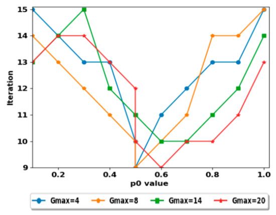 After the creation of groups, the consensus algorithm begins to find the agree capability AC. The average AC obtained is 1.4 with an error of 0.01 (the threshold value). The AC is computed by calculating the sum of ACs obtained from and 20, divided by four. The number of iterations to obtain the AC is changed according to the initial value of the deviation factor . As shown in Figure 6, the minimal and the maximal number of iterations obtained is 9 and 15, respectively. The best-chosen value of minimizes the number of iterations. So, initializing the best value of is difficult, because it depends on the groups’ cardinals. Anyway, the maximal number of iterations is fewer because the AC has been calculated strictly by the master groups, and the range of the groups’ cardinality is short, where they are semi-equal. However, in case where group construction is undefined, the number of iterations will be higher, and the algorithm will converge to the AC after a high number of iterations.