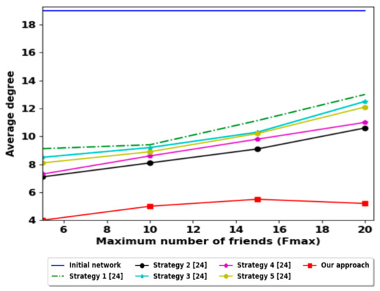 Table 5 shows the giant component and diameter of the network for our strategy compared with the other ones; the obtained value of each parameter is the average of four values obtained from and 20. Our approach and strategies 3 and 5 give the total giant component; as a result, there is a connection between any two pairs in the social network for our approach. Therefore, the greatest distance between any pairs of nodes should not exceed , where N is the number of nodes in the network, this parameter is minimized for our approach and for strategies 2 and 5, respectively.