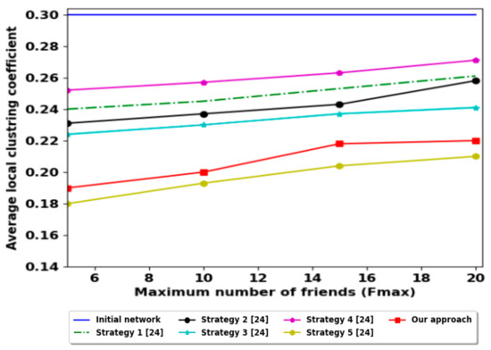The high value of the local clustering coefficient indicates that the nodes are highly connected i.e., we can achieve the provider node quickly [38]. Figure 9 shows that our contribution is not more efficient for this parameter. However, the average path length value as shown in Figure 10 is the best in comparison with all these strategies. This result denotes that we can achieve the provider node quickly. The results of these two parameters are not contradictory, due to the friendship selection in our contribution is focused on the diversification of friends; i.e., it ignores an important number of candidate friends (reduces local clustering coefficient) but encourages the social network nodes to make friends from different surrounding areas (decreases the average path length).