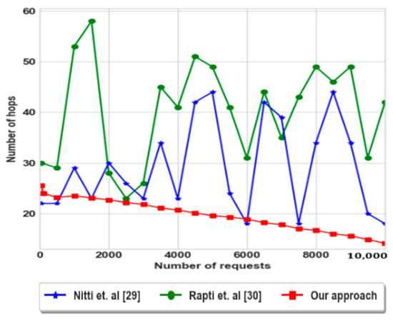 Figure 11 shows the number of hops to achieve the providers according to the number of requests. As illustrated, Nitti et al. [29] gives minimal hops than Rapti et al. [30] approach, but by a wobbling manner due to the requests that are retransmitted to the friends that have more centrality. However, the number of hops during the first requests is not minimal, but after a number of requests, our approach exploits its previous solutions, so that it converges to minimal hops. Therefore, our approach speeds up the search process by exploiting the obtained solutions.