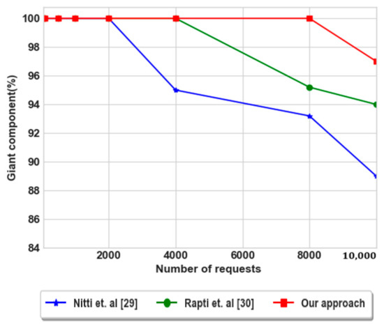The obtained result in terms of consumed energies is reinforced by computing the giant component of the three approaches during this process, as shown in Figure 14. We have achieved 100% of giant component until the 8000 requests, which means that the energies are balanced and the connection between any pair nodes is achieved. In contrast, for Rapti et al. [30] the giant component is 100% until the number of requests is 4000. We conclude that the network lifetime of our approach is twice than Rapti approach. The increase of network lifetime allows nodes to be connected as long as possible.