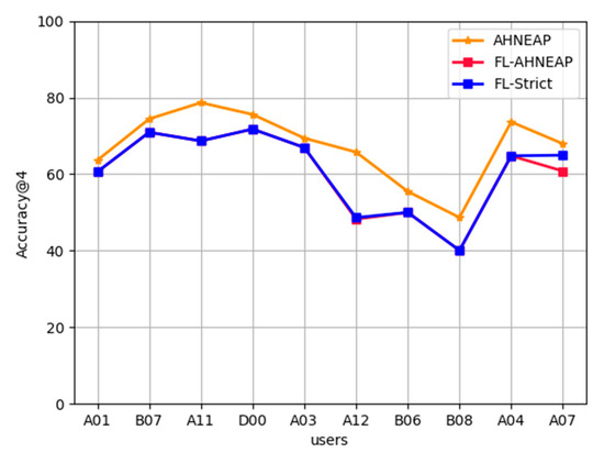 AHNEAP vs. FL-AHNEAP: Figure 3 compares the accuracy between the AHNEAP method and the FL-AHNEAP method. The FL-AHNEAP method uses 10 users for 20 rounds of communication, and each user is trained for five rounds at the terminal. As for the AHNEAP method, each user is trained for 100 rounds independently. FL-Strict strictly implements the FL-AHNEAP method, selecting 15 users for training and conducting 20 rounds of communication. The users are trained at the terminal for five rounds, and five users are randomly selected to participate in one round of communication according to a one-third ratio. It can be seen from Figure 3 that the experimental results of FL-AHNEAP and FL-Strict are not much different, but the accuracy of the two is generally lower than that of the AHNEAP method of single-user data. Among these, the accuracy of user D00 is the highest, reaching 72%, whereas user B08 has the lowest accuracy, of only 40%. For user A12, the accuracy of the FL-AHNEAP method is 17.5% lower than that of the AHNEAP method, which is the largest difference among all users, whereas the difference of user A03 is the smallest, at only 2.5% lower. This is because the FL-AHNEAP method destroys the structural property of the network to a certain extent; from the perspective of federated learning, it is equivalent to sacrificing part of the accuracy to obtain privacy protection.