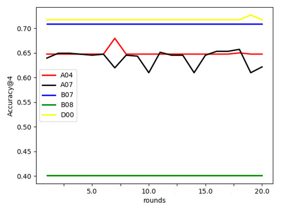 Effect of communication rounds on FL-AHNEAP:Figure 4 compares the effect of communication rounds on FL-AHNEAP. Five users are selected to train the shared model. Each time, the communication terminal only performs one round of training for the representation learning on the attributed heterogeneous network, and a total of 20 communication rounds are performed. It can be seen from the figure that the communication rounds have little effect on the prediction accuracy. For users D00, B07, and B08, there is almost no effect, whereas user A04 has a slight fluctuation, and A07 is relatively unstable. Generally speaking, however, the fluctuation range of prediction accuracy is not large; thus, in this case, it may only need one round of communication to obtain better results.