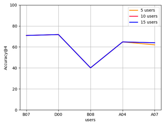 Analysis of cold start of new users: In the FL-AHNEAP method, each user can obtain a shared model, that is, a representation learning model for the attributed heterogeneous network. Therefore, for the cold start problem of new users, we can calculate the embedding of each new code based on the shared model, then calculate the cosine similarity of the node embedding, and select the node with higher similarity as the prediction result. Figure 8 shows the prediction accuracy results of the shared model (obtained after training based on the data of ten users: A01, B07, A11, D00, A03, A12, B06, B08, A04, and A07) to five users: D03, A06, A02, B03, and D04, who have not participated in the training. If a new user does not have a historical record at all, we can only make predictions based on the current time and location information. It can be seen that, except for D03, the prediction accuracy obtained by time and location information is almost the same, and all accuracies are higher than 20%. If a new user has some historical records, the prediction accuracy of time, location, and previous App can be considered at the same time. It can be seen that the prediction accuracies based on the previous App are much higher than that of time and location information, and all are higher than 50%. User D03 achieves the highest result, reaching 71%, whereas user D04 is the lowest, but also has an accuracy of 51%. In actual situations, it is impossible for a new user to have no App usage record at all, so the candidate App set can be obtained by selecting the previous App information.
