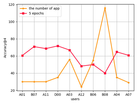 In this experiment, ten users—A01, B07, A11, D00, A03, A12, B06, B08, A04, and A07—were selected as the representative users to realize the mobile App start-up prediction method based on federated learning. Because it is a simulation experiment, and there are restrictions on the number of users in the dataset, we did not select many users to participate in the training, and did not randomly selected users for the training. In each round of communication, the clients corresponding to these 10 users were directly selected to perform the aggregation of the shared model parameters, which is equivalent to the parallelization of synchronous data in distributed learning, and all user data were selected to train the shared model. Then each terminal trained a personalized link prediction model based on the neural network according to the shared model. During prediction, each terminal first generates the node embeddings of the current time, location, and previous App according to the shared model, and then aggregates the node embeddings as the input, obtains the prediction probability based on the neural network model, and generates the candidate App set.