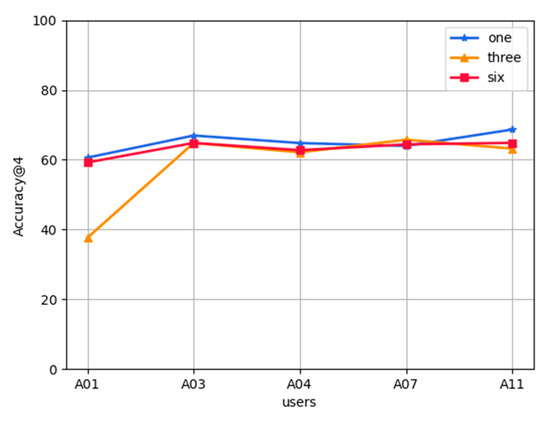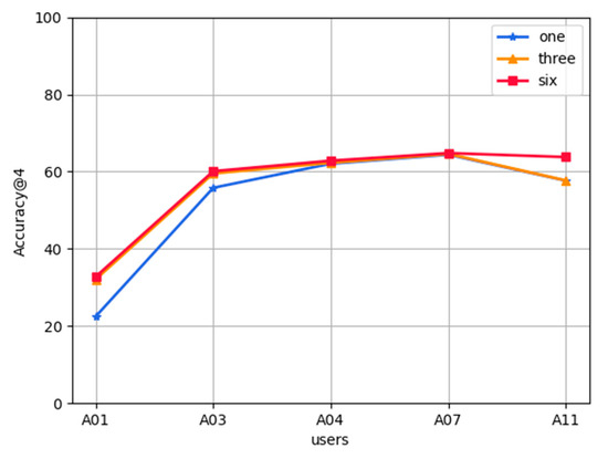 Effect of the number of user historical records on FL-AHNEAP:Figure 9 shows the effect of the number of user historical records on the FL-AHNEAP method. One month, three month, and six month data of five users are selected for training, including 80% for the training set and 20% for the test set. The figure shows that the number of user historical records has little effect on the FL-AHNEAP method, and the fluctuation of the prediction accuracy of each user is small. When only one month’s data of each user is selected for the training, the accuracy tends to be slightly higher.