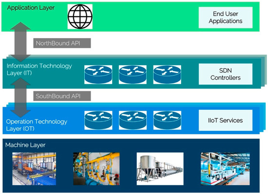 - Information Technology Layer: This layer does not directly involve workers and machinery, so it is possible to have more relaxed requirements compared with the OT. Here, the SDN controllers are the glue that realizes the interaction between the machine layer and the application layer. In particular, the SDN controller represents the network control plane, and therefore, we propose the use of a distributed SDN controller that provides scalability for IIoT networks at scale. On the one hand, this layer directly manages the physical devices such as the IIoT devices via several interfaces and protocols (e.g., the southbound interface) and adapts their behavior according to the application requirements. On the other hand, this layer provides information to the application layer through the northbound interface and API. In the context of Industry 4.0, the SDN can customize the services provided according to the application requirements (e.g., data transmission rate and real time constraint).