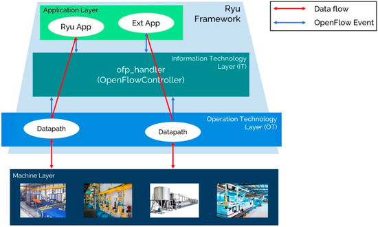 In particular, a Ryu application consists of a Python script that extends the RyuApp base class and implements the observable and observer interface. These interfaces allow the application to interact with the event-based communications in the Ryu framework. First, the Ryu framework starts the application manager that loads both the Ryu-based applications and external applications and registers the associated events. The most important application in the Ryu framework is ofp_handler, which allows the framework to interact with the OpenFlow protocol (OpenFlowController class). To efficiently communicate with the switches, the Ryu framework creates a virtual representation of switches, called the Datapath. Figure 2 shows the logical architecture of the Ryu SDN framework in our proposed architecture. The ofp_handler operates as the SDN controller in the IT layer. In particular, it manages the data paths that are at the OT layer. The Ryu apps, once invoked by an event, can reply directly to the data paths.