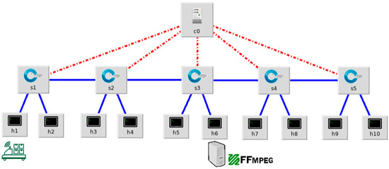 To see how DoS attacks affect possible services in the network, two scripts were used to simulate a streaming service via the FFmpeg command. In particular, as shown in Figure 3, host H6 was used as a server and host H1 as a client that was sending an mp4 video to the server continuously, just as in video streaming, to simulate object recognition tasks, for instance. In all simulations, the hping3 tool was used to simulate DoS attacks to the SDN controller, and the options used are described in Table 2.