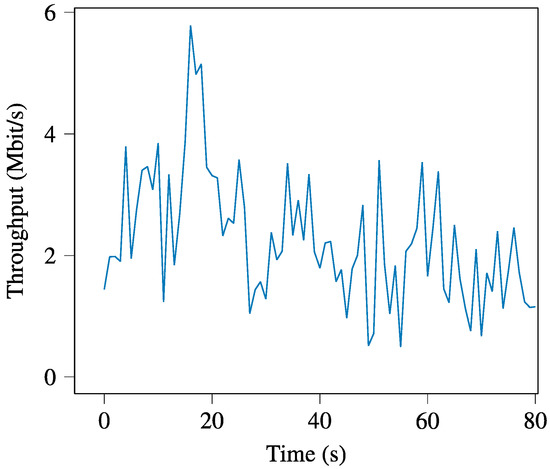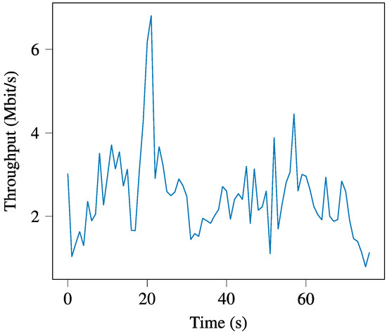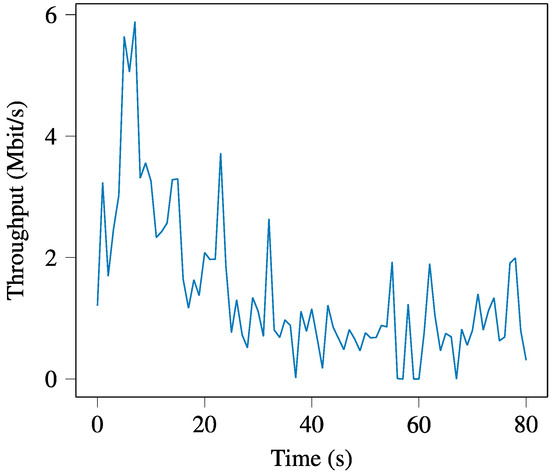 For the attack where H9 attacked H3, the result was very similar, as shown in Figure 5. Even if the attack crossed the client–server path, the decrease in the throughput was modest. The average throughput was 2.49 Mbit/s.
