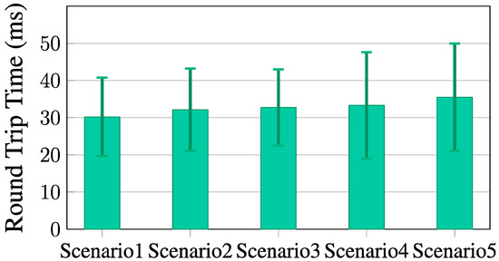As shown in Figure 9, the average RTT recorded in the observed time window was around 30 ms for all scenarios. Moreover, as discussed above, most time-sensitive applications in the I4.0 context have a strict cycle time nearly in the range of 1 ms [59]. What we observed was an increase in the average RTT due to a large number of packets that passed through the switches. This behavior can seriously compromise delicate tasks such as remote-control motion, which can endanger workers’ lives when working on a farm. Finally, we referred interested readers wanting further experimental results on, for instance, scalability and reliability to the SIRDAM4.0 paper [11], where they can find more details and experimental results about the ongoing implementation.