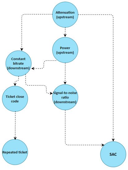 Table 5 are combined with the 17 possible causes identified within the ticket close code variable. Constant bitrate in downstream is measured in bits per second. Attenuation in upstream is measured in dB and power in upstream is measured in dBmV.