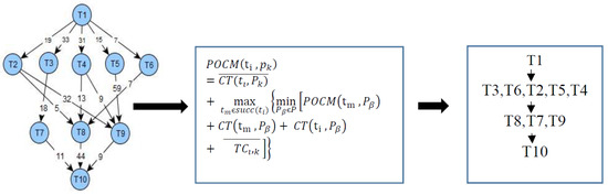 While prioritizing the task, consider one of the important tasks of the present task, which is nothing but its successor in the critical path node and the number of successors. For the DAG1, the cost matrix is shown in Figure 3a,b, while Table 1 shows the priority based on the matrix. The tasks’ priority list by is ordered as (T1, T3,T6,T2,T5,T4,T8,T7,T9,T10), the tasks’ priority list by is ordered as (T1,T5,T6,T2,T4,T3,T8,T7,T9,T10), and the tasks’ priority list by is ordered as (T1,T4,T6,T2,T3,T5,T8,T7,T9,T10). The ranking method can forecast the rank in the initial phase by considering the importance of a task’s relation, and the technique is similar to the rank calculation with . On comparing with we can see that include and which is similar to the [11] and method [13].