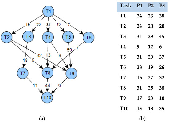 (a) Sample DAG with the transfer cost of 10 tasks. (b) Computation cost of 10 tasks and 3 processors.