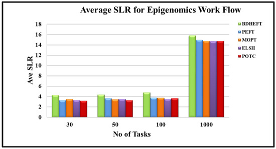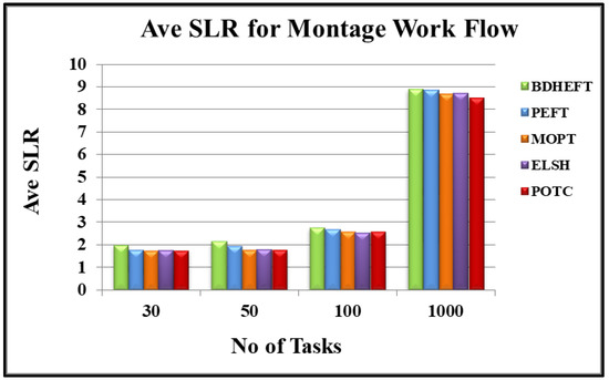 The results obtained by the POTC algorithm—along with the ELSH, MOPT, PEFT, and BDHEFT and their performance—are presented in this section. For the purpose of the experiment, two sets of workflow applications called ‘Epigenomics’ and ‘Montage’ were taken, and they represented the workflow real-world problems of genomics and astronomical Image Mosaic Engine. Firstly, the comparison metrics termed scheduling length ratio (SLR), for the proposed and existing algorithms were described.