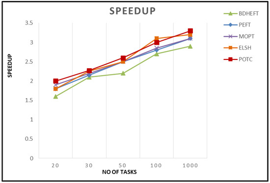 Speedup: The speedup for any given graph is obtained by the division of the cumulative implementation time of the tasks in the graph by the length of the schedule. In other words, it is the sequential implementation time to the parallel implementation time. The sequential time is calculated by allocating all tasks to a single processor that reduces the implementation costs. If the total sum of the implementation costs is increased, it results in a larger speedup. Figure 6 shows the Speedup of the proposed algorithm compared with existing algorithms [27,28].