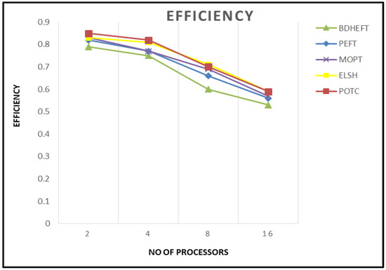 Figure 7 shows the efficiency of the BDHEFT, PEFT, MOPT, ELSH, and POTC algorithms. It shows that the performance of PEFT is very similar to that of MOPT. Higher values of efficiency are obtained by the proposed algorithm. For every algorithm, the makespan decreases as the number of processors is increased.