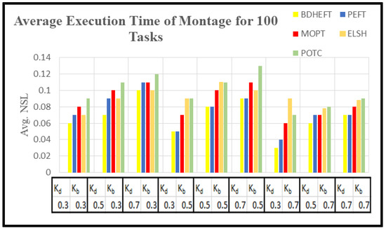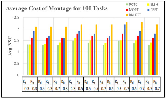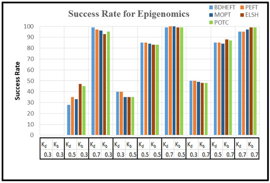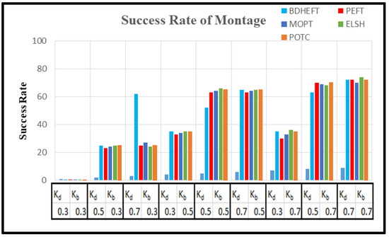 The graph of as in Equation (16) is captured with around 50 runs of simulations. The BDHEFT, PEFT, MOPT, ELSH, and POTC algorithms are selected for comparison. The processors that are supported by Workflowsim have processors with varying configurations, and their time and cost parameters vary. The deadline ratio () and Budget ratio ( values are considered as and . Some of the real-world applications, such as Epigenomics (I/O intensive workflow) and Montage (compute intensive workflow), are taken for analysis with 100 tasks, as shown in Figure 8 and Figure 9. Montage has a high communication to computation ratio [29,30,31], and epigenomics has a low communication to computation ratio . The success rate is always inversely proportional to. For Epigenomics, as shown in Figure 8, POTC has obtained a performance similar to those of MOPT and PEFT for the deadline (kd) = 0.7. The obtained performance using POTC is better when compared to BDHEFT for large budgets (kb).