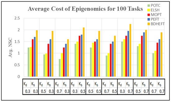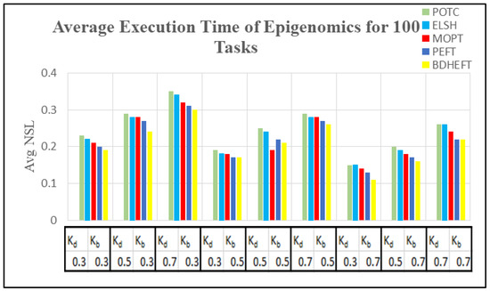 Using 50 runs of simulations, both and are captured. Figure 10, Figure 11, Figure 12 and Figure 13 show the NSL and NSC of POTC-generated schedules with respect to ELSH, MOPT, PEFT, and BDHEFT. The deadline factors are set as 0.3, 0.5, and 0.7. The budget is relaxed by fixing the deadline and varying the budget for different values of = 0.3, 0.5, and 0.7. To assign the workflow tasks, the scheduler chooses the fastest or the expensive resources. Thus, for the created schedule under the same deadline, tends to increase with the decrease in [34].