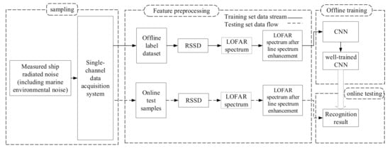 In this paper, we consider a deep-learning underwater target-recognition framework based on multi-step decision LOFAR line spectrum enhancement which is shown in Figure 1. It is divided into four modules: sampling, feature preprocessing, offline training and online testing.
