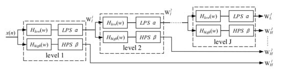 In summary, in the TQWT algorithm, Q, r, J can be calculated by selecting , , and ,  selection is only determined by the inherent oscillation characteristics of the signal. Therefore, it can flexibly select ,  according to the specific requirements of Q, r, J. For the input signal of ship radiated noise, we need to set , ,  to extract its high-resonance information and set , ,  to extract its low-resonance information.