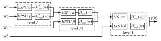 TQWT is a discrete wavelet transform that can flexibly adjust the constant Q factor according to the resonance of the processed signal, which has an overcomplete basis and can be perfectly reconstructed []. This section uses the TQWT toolbox to complete simulation experiments and signal processing. The implementation framework consists of two filter banks which are analysis filter bank and integrated filter bank. They are shown in Figure 3 and Figure 4. A filter bank refers to a group of filters. They have a common input, or a common output. The analysis filter bank has a common input to obtain multiple subband signals. In contrast, the integrated filter has a common output, combining multiple subband signals into a single signal to restore the original analyzed signal.