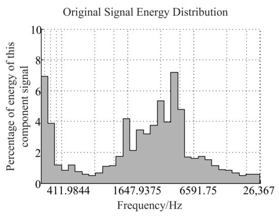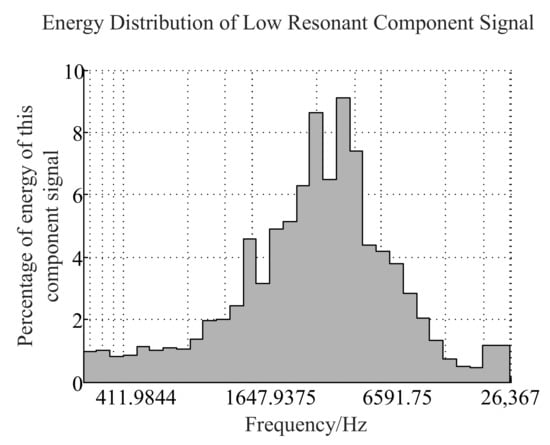 From the energy percentage of each frequency band in Figure 6, the energy distribution of the low-resonance component is mostly concentrated in the higher frequency band (greater than 1000 Hz), while the energy distribution in the low-frequency band is very small. Compared to Figure 7, we find that higher energy distribution of the original signal comes from the low-resonance component. In Figure 8, most of the energy of the high-resonance component is concentrated in the low-frequency narrow band, and the narrow band energy distribution characteristic is usually regarded as a line spectrum. In previous studies, the low-frequency line spectrum is the main manifestation of mechanical noise and propeller cavitation noise in the LOFAR spectrum. It is also an important basis for the identification of ship radiated noise. Therefore, the separated high-resonance component retains the main features of underwater target recognition well.