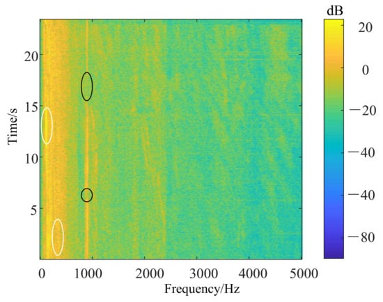 For the line spectrum enhancement algorithm based on multi-step decision, the experimental results are shown in Figure 9 and Figure 10, which are the LOFAR spectrum of the original signal and the LOFAR spectrum after line spectrum enhancement. In Figure 9, there is an obvious line spectrum in the part marked by white circles, but the line spectrum is broken in the part marked by black circles. In Figure 10, the line spectrum indicated by the white circles are extended to completeness, and the vacant part of the line spectrum indicated by the black circles is also completed. Therefore, even if the line spectrum in the LOFAR spectrum has “breakpoints”, “broken lines” or only a short line due to noise interference, the line spectrum enhancement algorithm can still extend and complete the line spectrum.