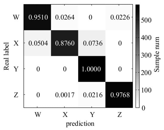 Figure 11 shows the standardized confusion matrix. The recognition accuracy of the radiated noise of the four types of ships is different. Among them, the recognition effect of the Y-signal is the best and the recognition accuracy rate reaches 100.00%. The recognition accuracy rates of the W-type and Z-type are slightly worse, and they are 95.10% and 97.68%. Additionally, the recognition effect of the X-type is the worst, which is only 87.60%. In summary, the total recognition accuracy rate is 95.22%. The recognition accuracy of four kinds of measured ship radiated noise is shown in Table 7.